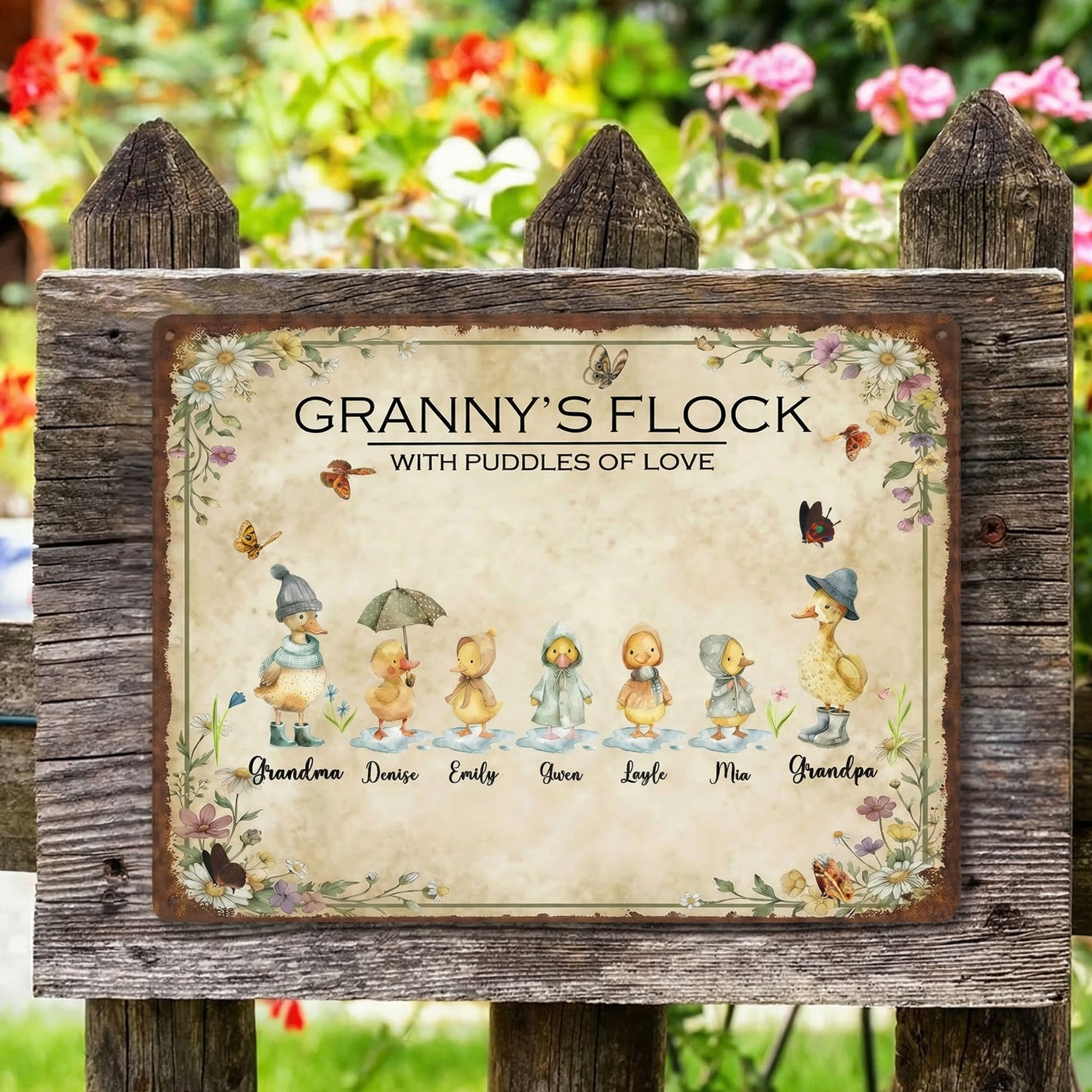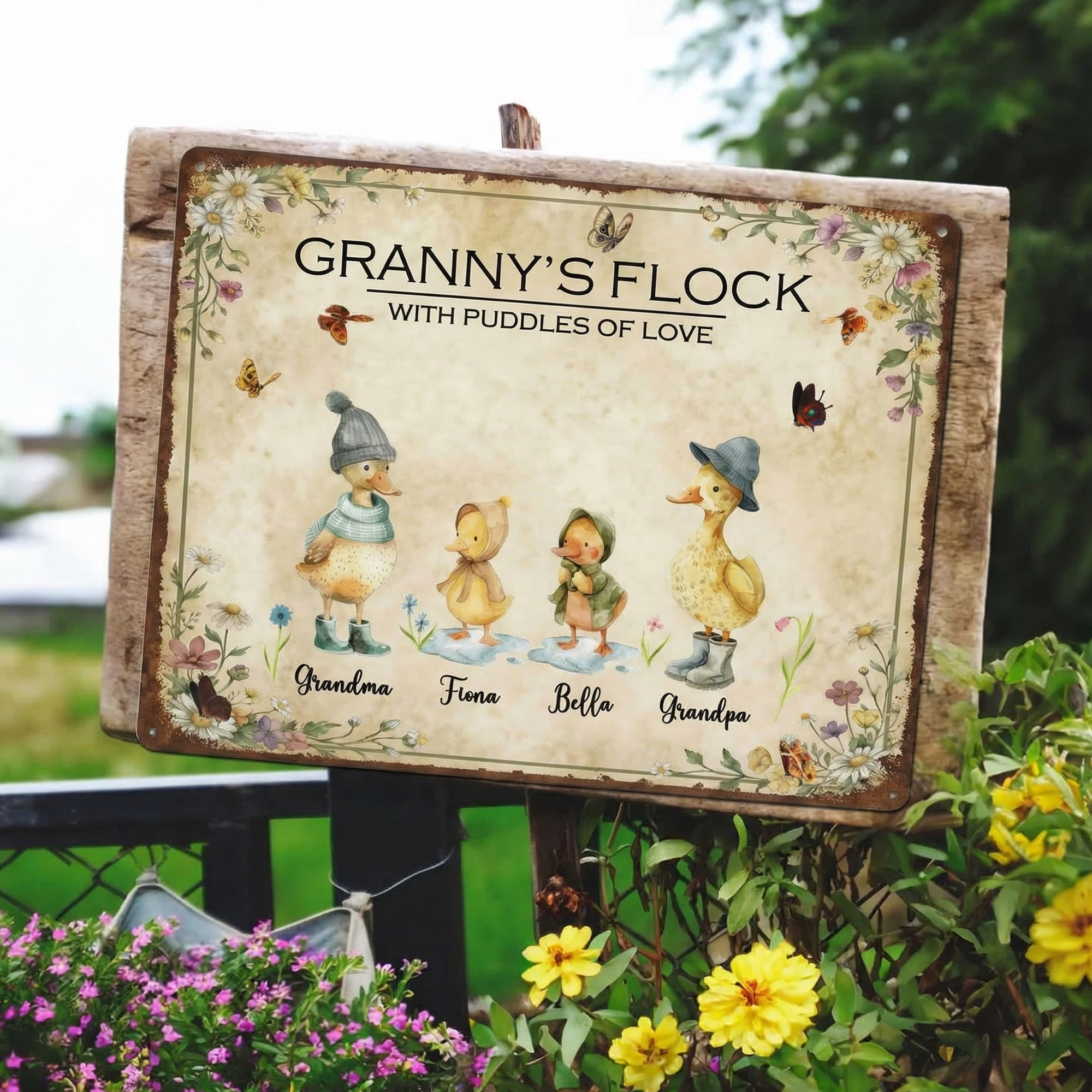Charming Duck Family Art – This garden sign features a sweet watercolor illustration of a duck family walking through a floral meadow. Each duck is uniquely styled, surrounded by wildflowers, butterflies, and gentle raindrops, creating a nostalgic scene full of warmth and love.