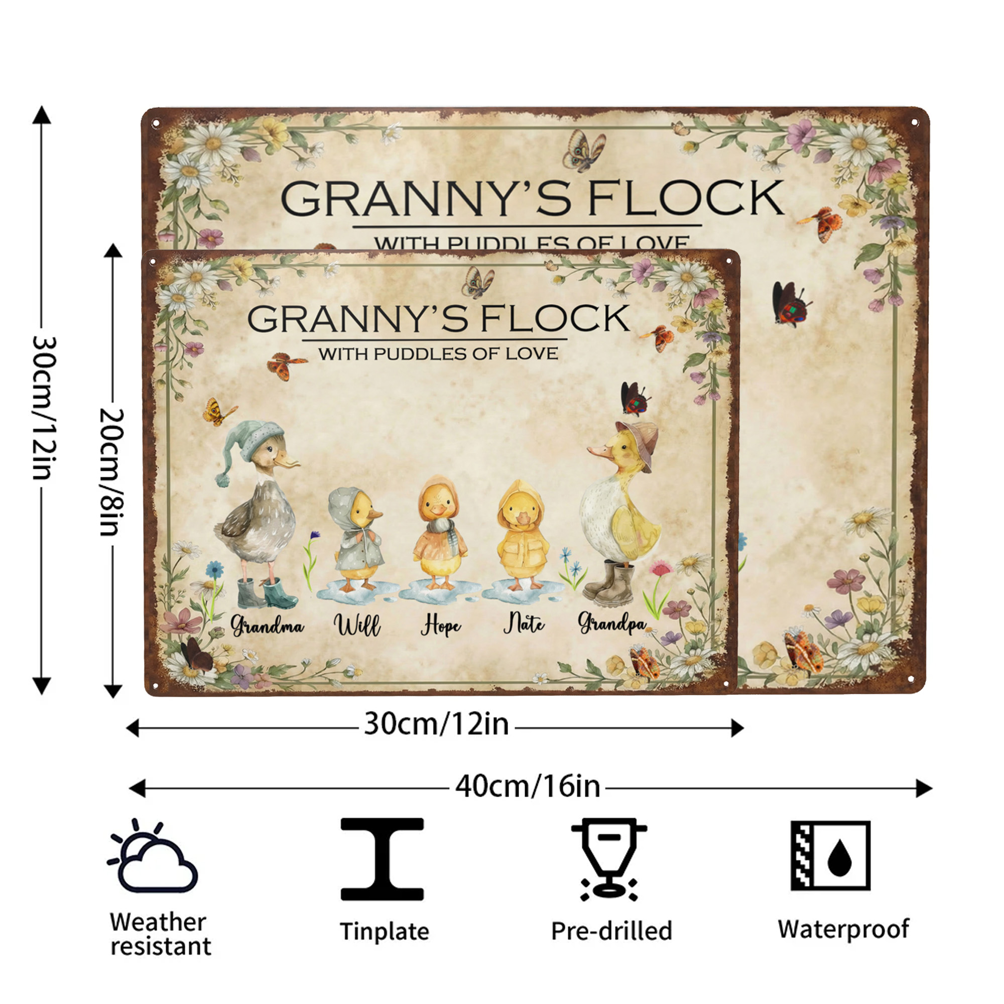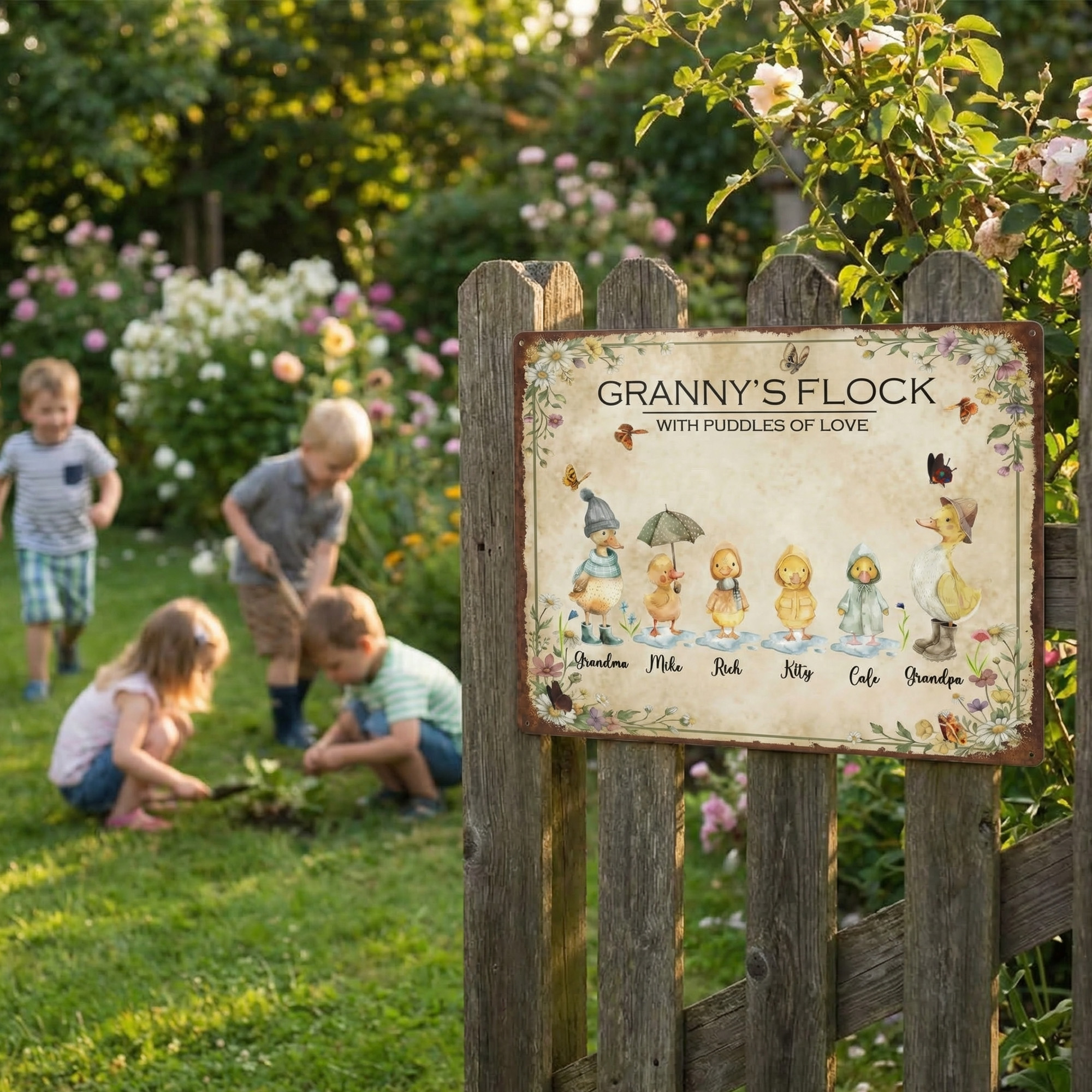 Custom 1-8 Names Watercolor Duck Family Garden Sign, Tinplate Vintage Granny's Flora Flock Outdoor Plaque, Birthday/Mother's Day Gift for Mom/Grandma