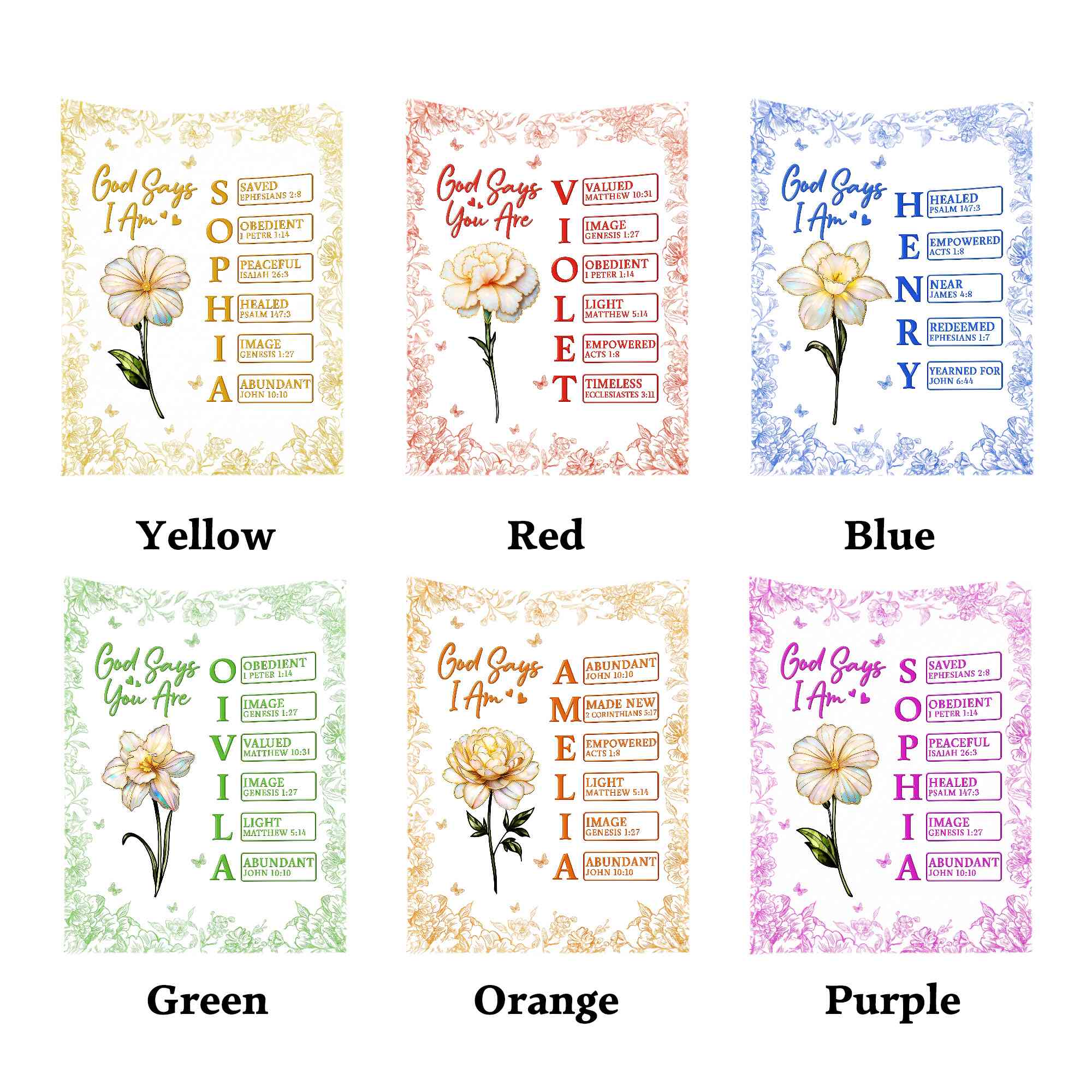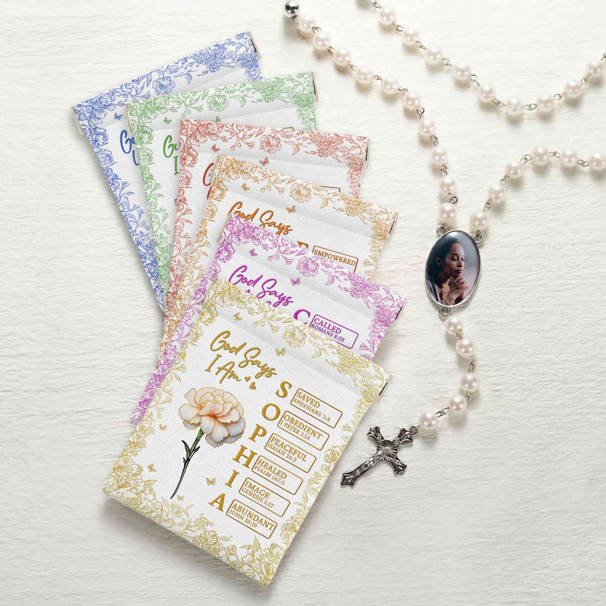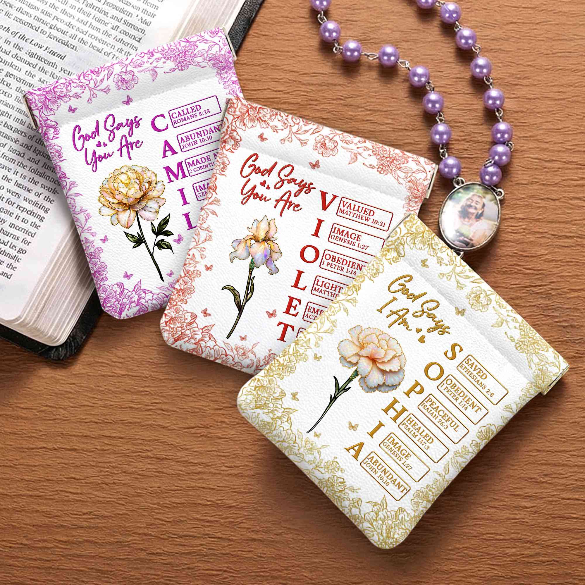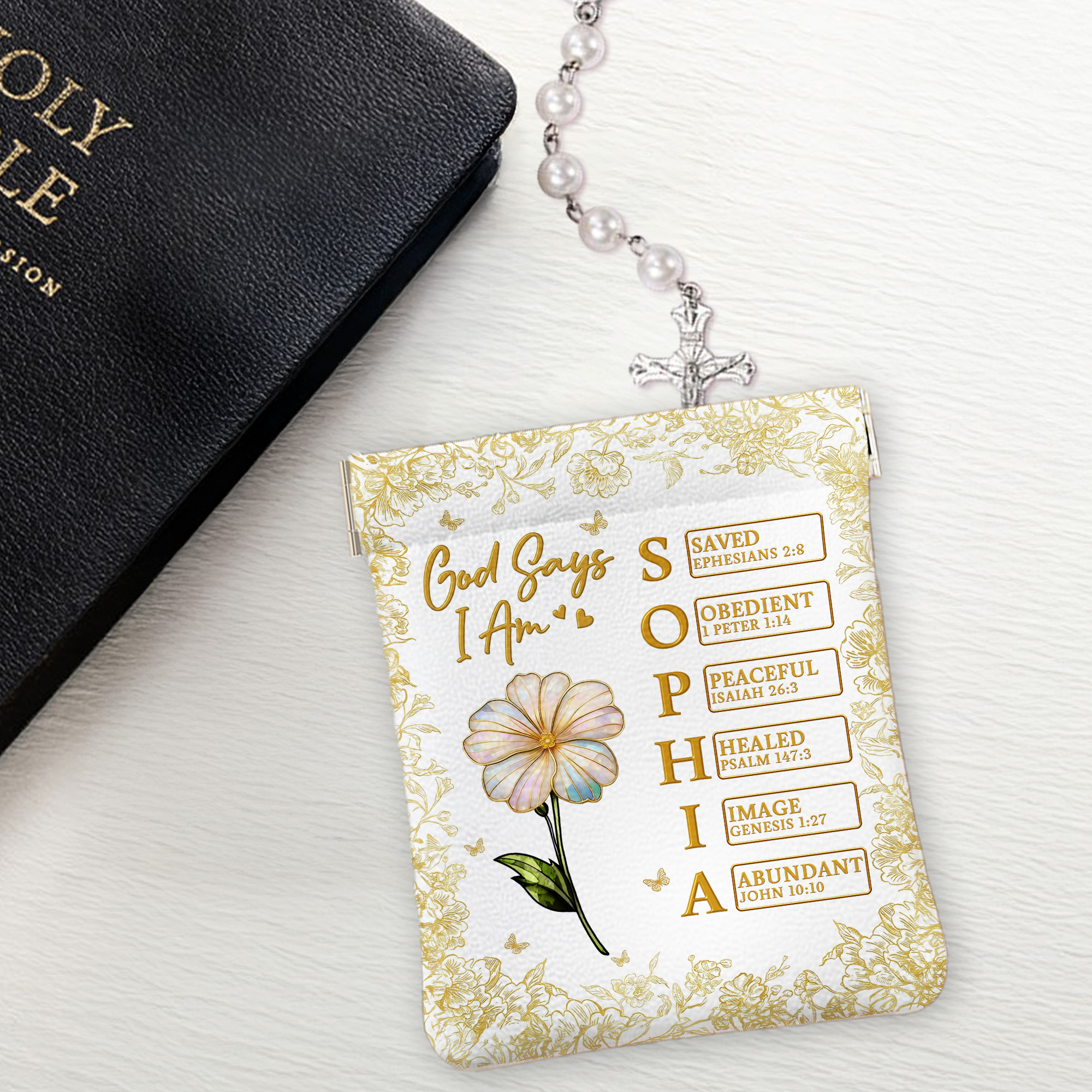 Style Custom Name Birth Flower God Says I Am Bible Verses Leather Rosary Pouch