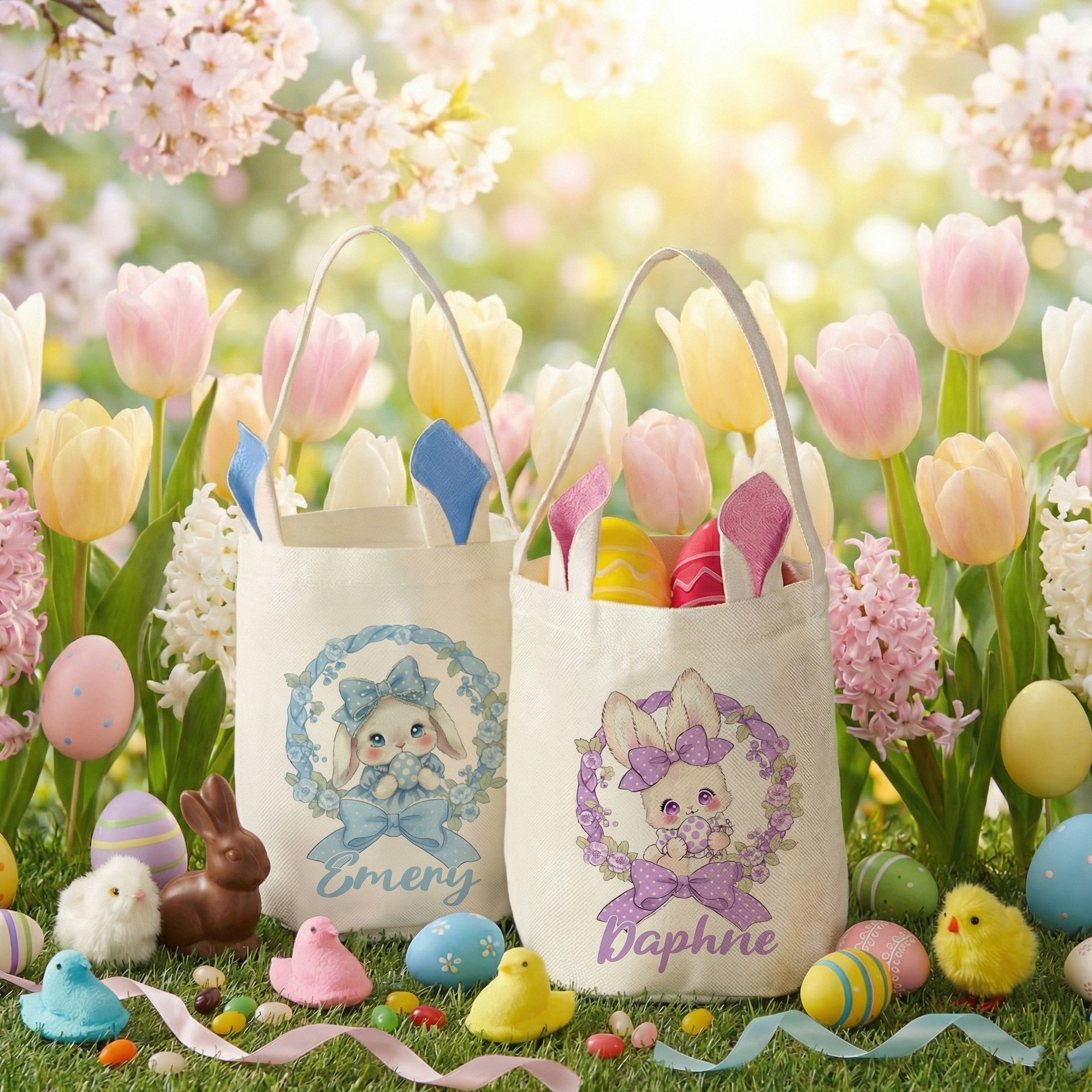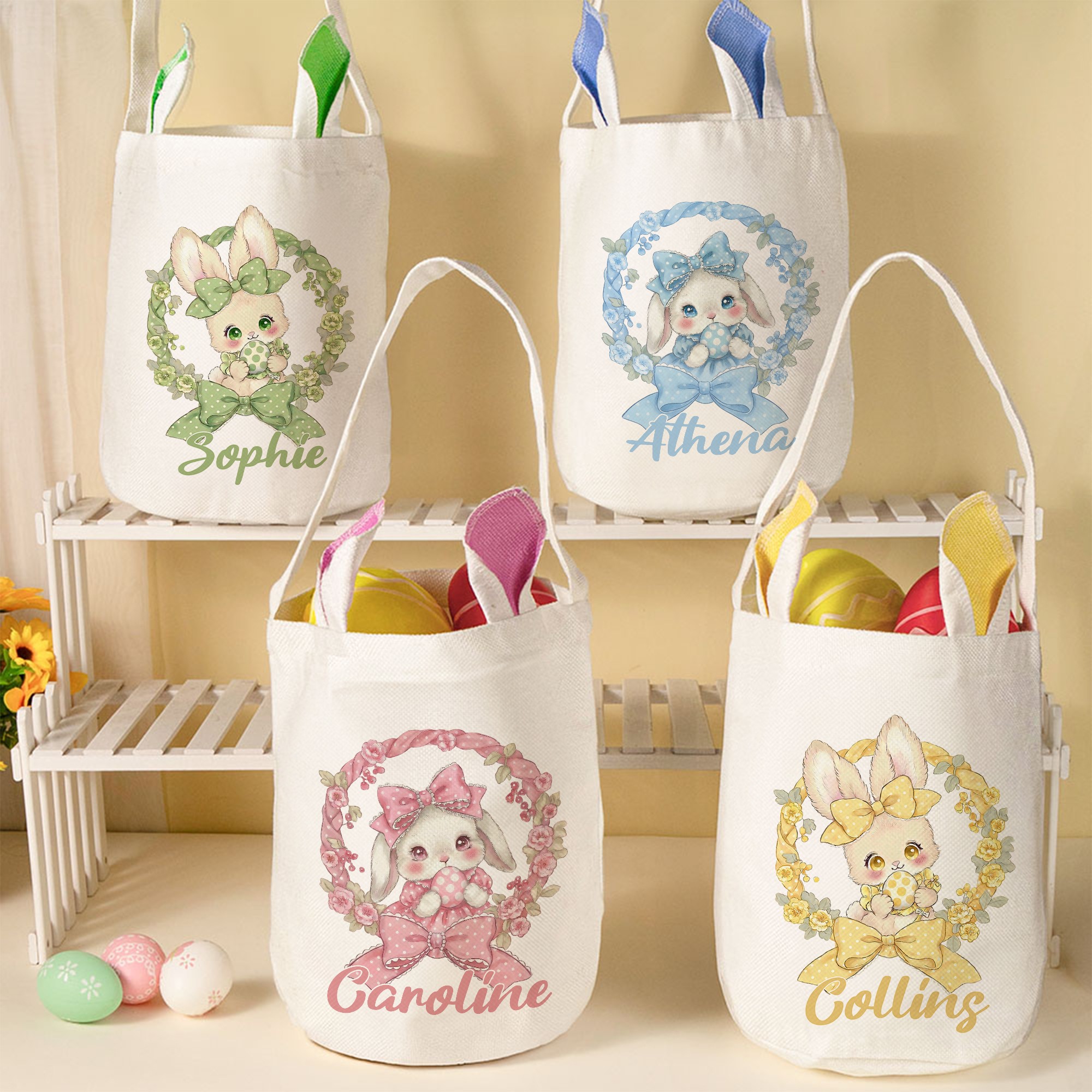Custom Name Bunny Floral Wreath Bow Easter Basket, Cotton Linen Easter Bucket Bag with Bunny Ears, Easter Party Favor, Easter Gift for Kids/Boys/Girls