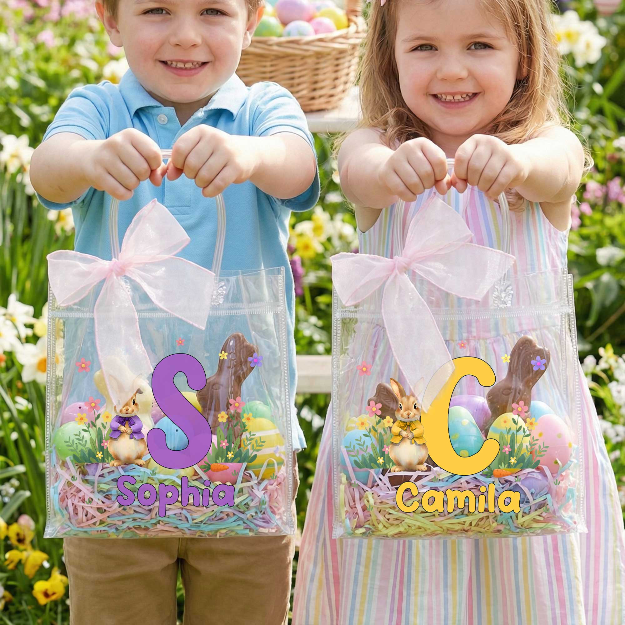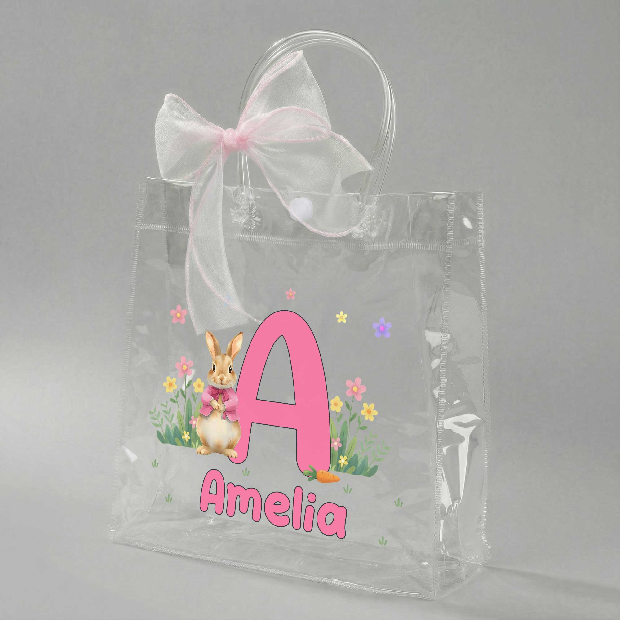 Custom Name & Initial Easter Bunny Gift Bag with Pink Bow Ribbon, Clear PVC Easter Egg Hunt Bag, Easter Party Favor, Easter Gift for Kids/Boys/Girls