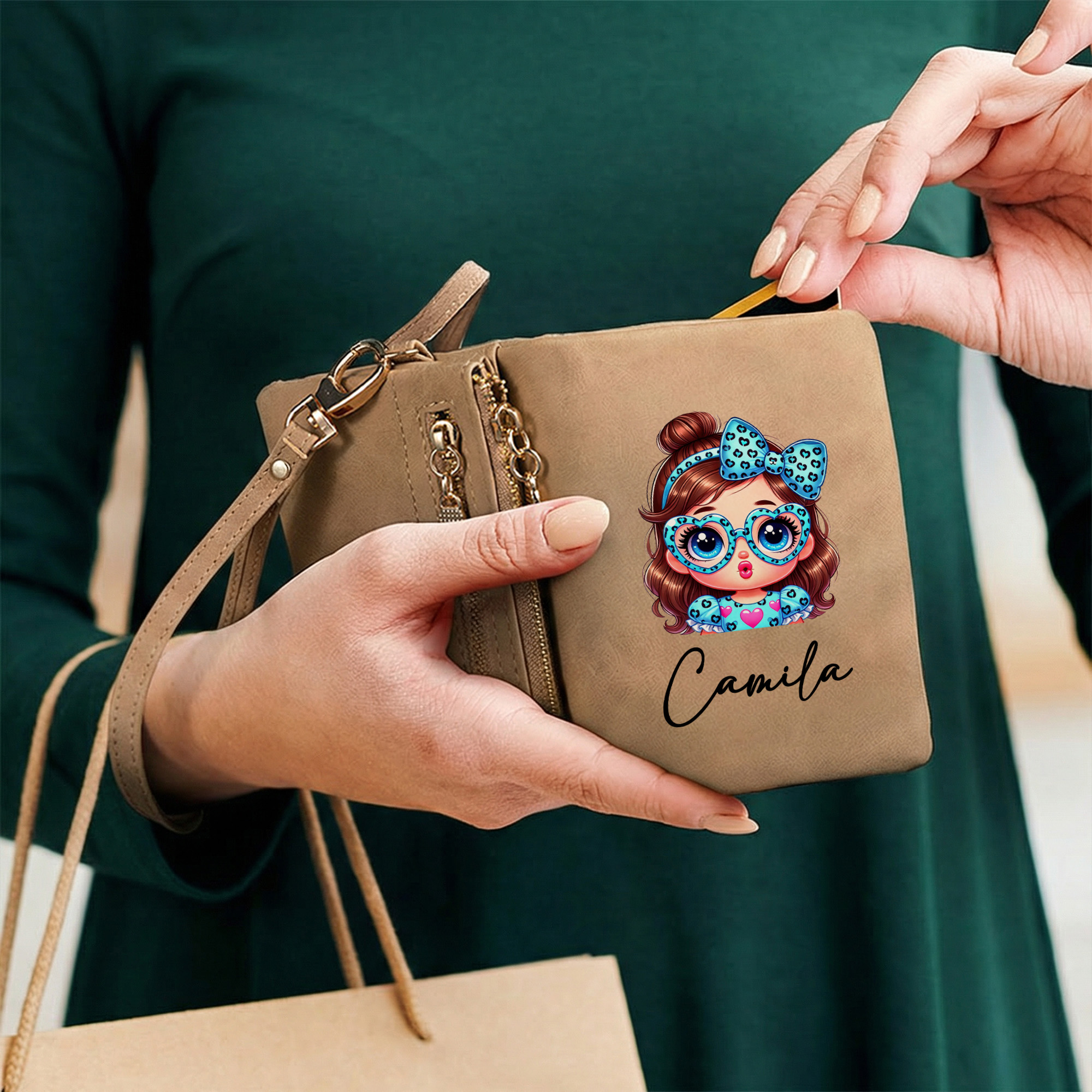 Playful Leopard Cartoon Design – This tri-fold wallet features an adorable cartoon baby girl with oversized eyes, stylish glasses, and a bold leopard-print bow. The vibrant illustration is printed on smooth, soft-touch material, blending whimsy and modern flair for a look that’s fun, fresh, and full of personality.