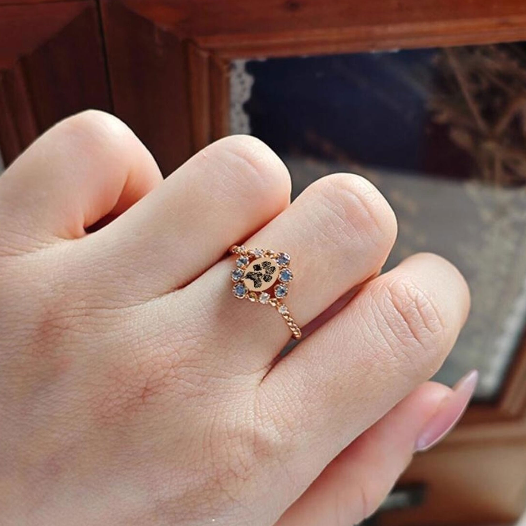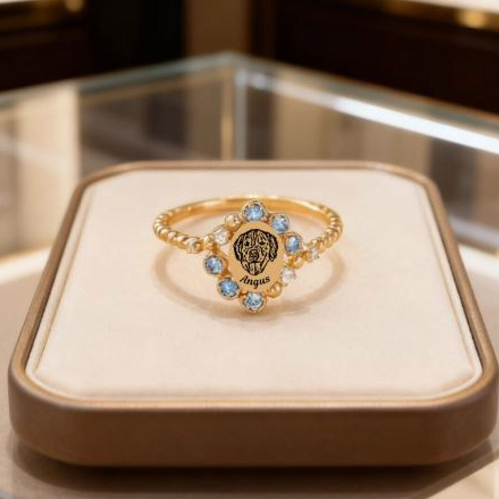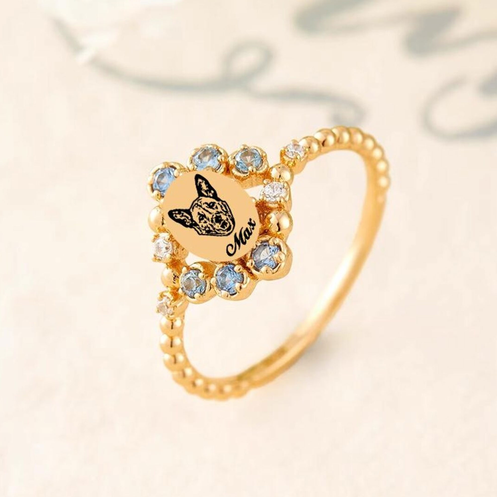Vintage Pet Portrait Design – This elegant ring features a delicate oval centerpiece engraved with a detailed portrait, surrounded by a floral halo of sparkling birthstones. The vintage-inspired design blends artistry and sentiment, creating a timeless piece that honors the unique spirit of a beloved pet.