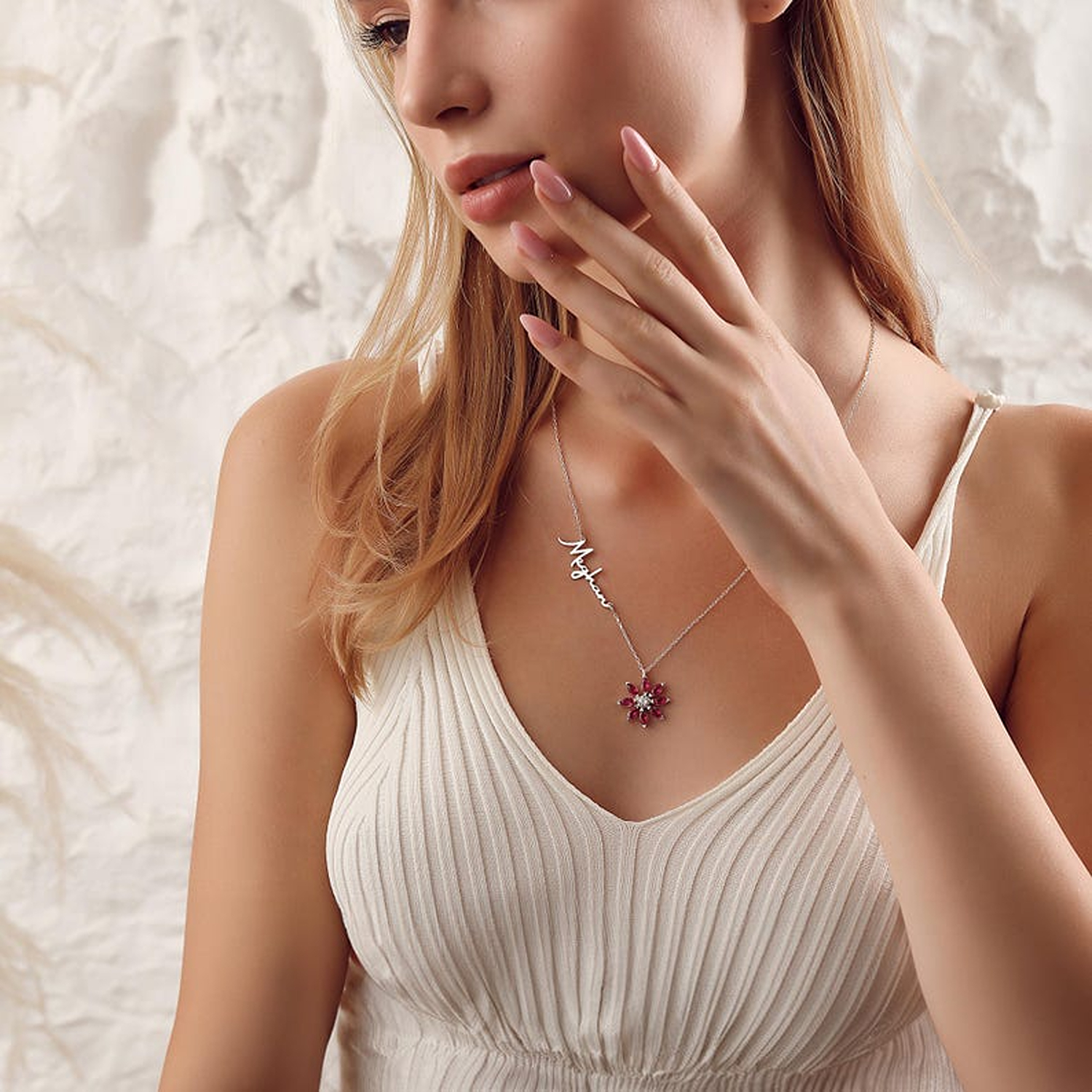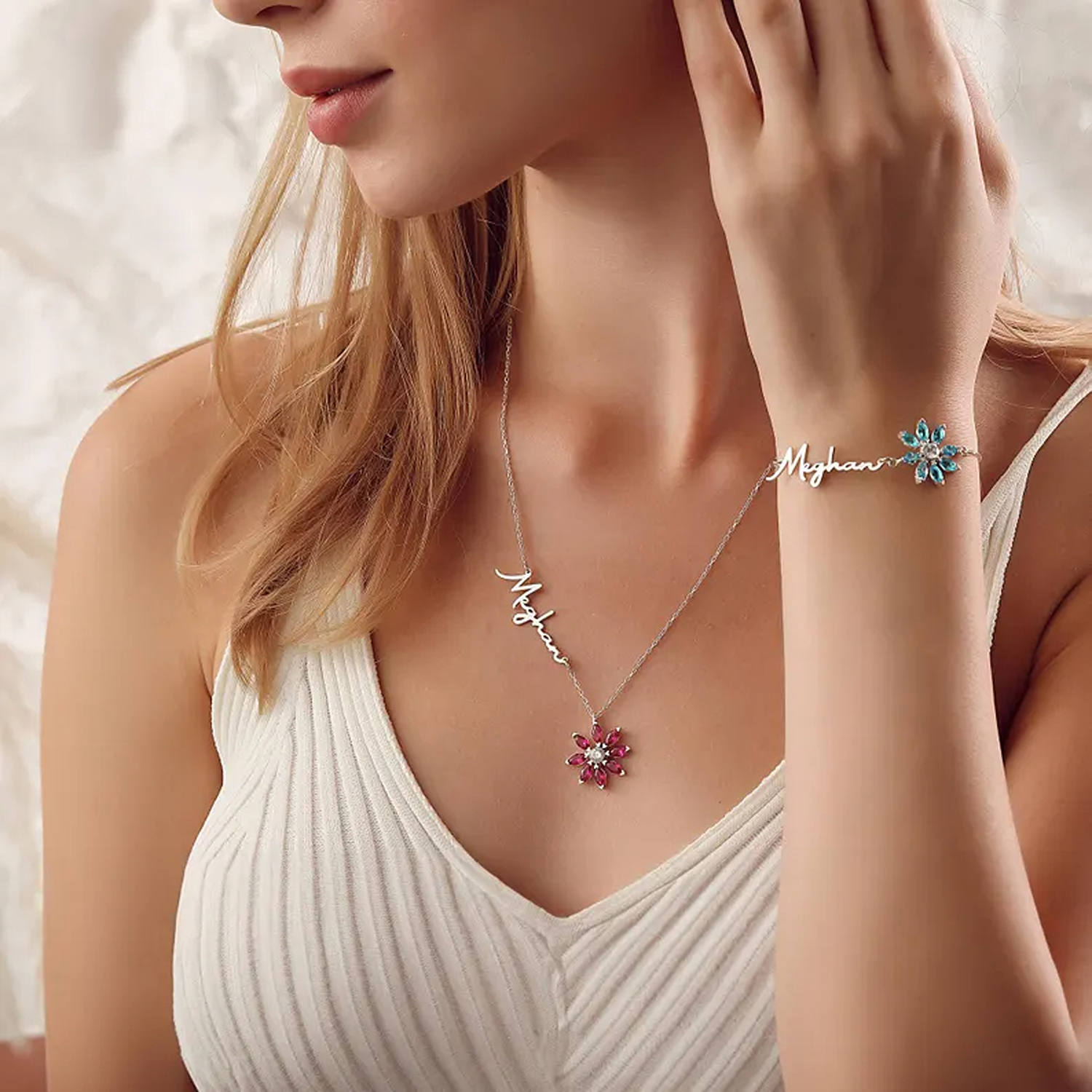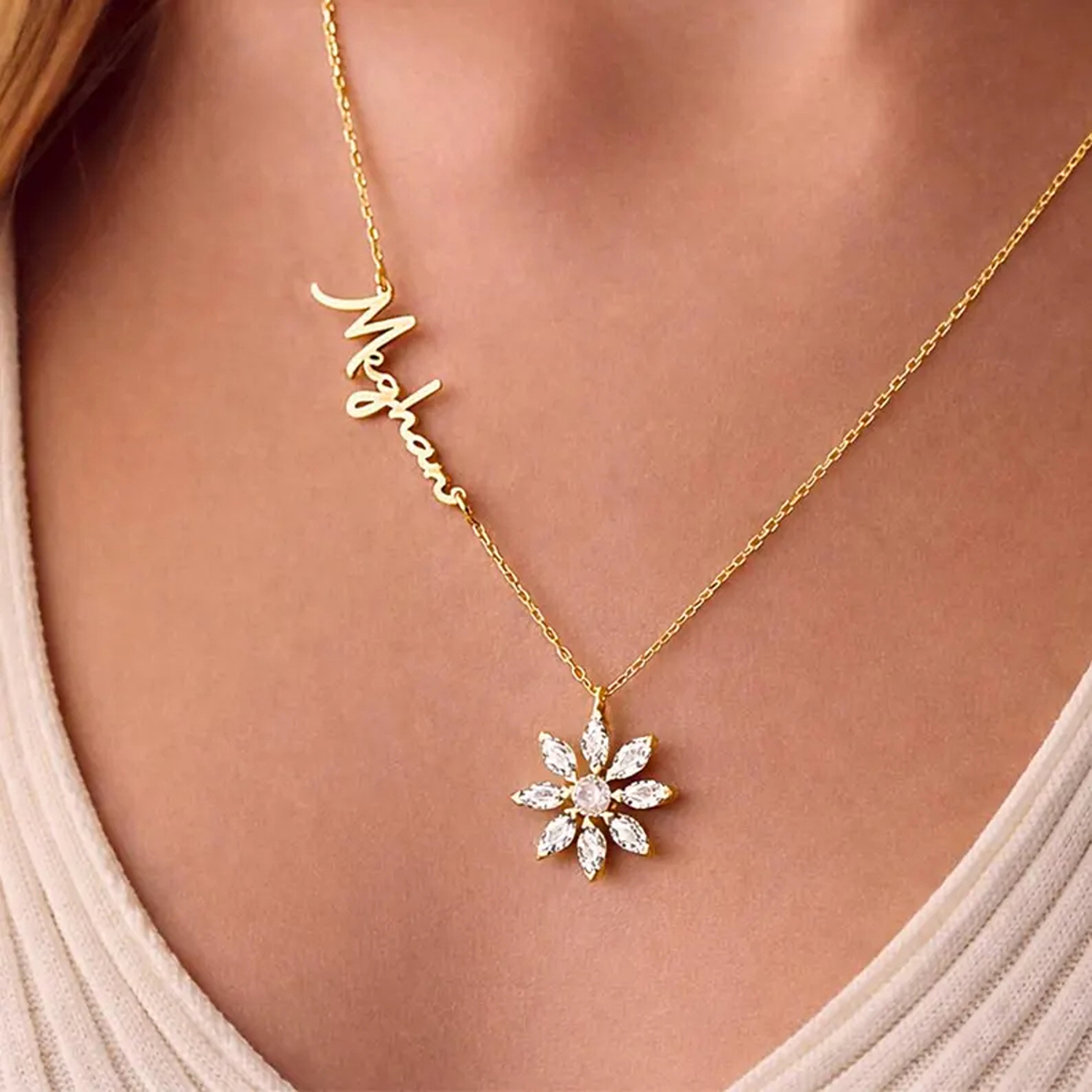 Custom Name & Birthstone Flower – Your chosen name is printed in flowing cursive script along the chain, paired with a dainty flower charm set with colorful gemstones. This thoughtful detail turns a simple necklace into a meaningful keepsake that feels uniquely yours.
