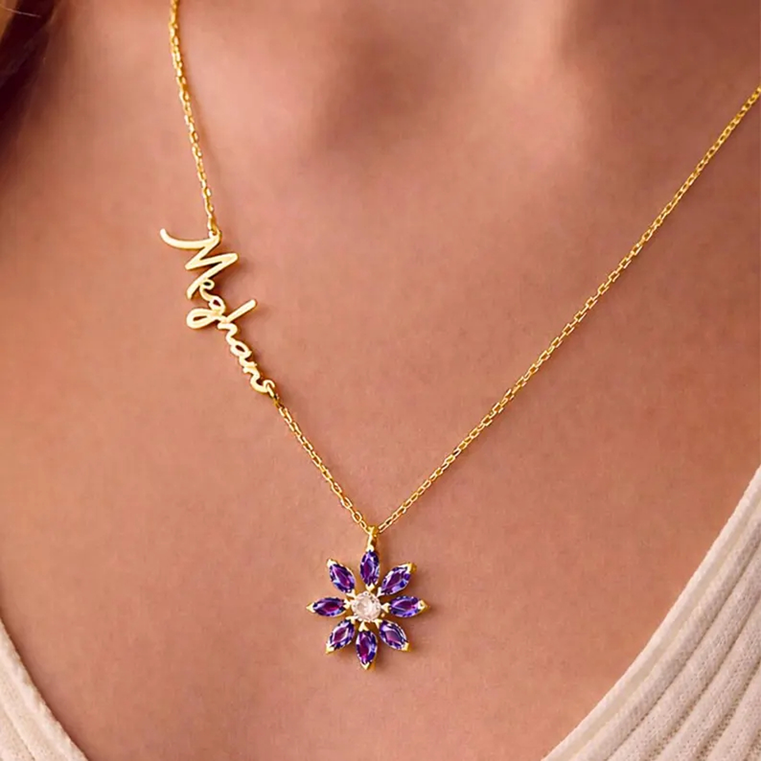 Floral Birthstone Necklace – A delicate pendant necklace featuring a sparkling flower with birthstone accents and a personalized name. The elegant design captures the beauty of nature and love, making it a graceful addition to any outfit.