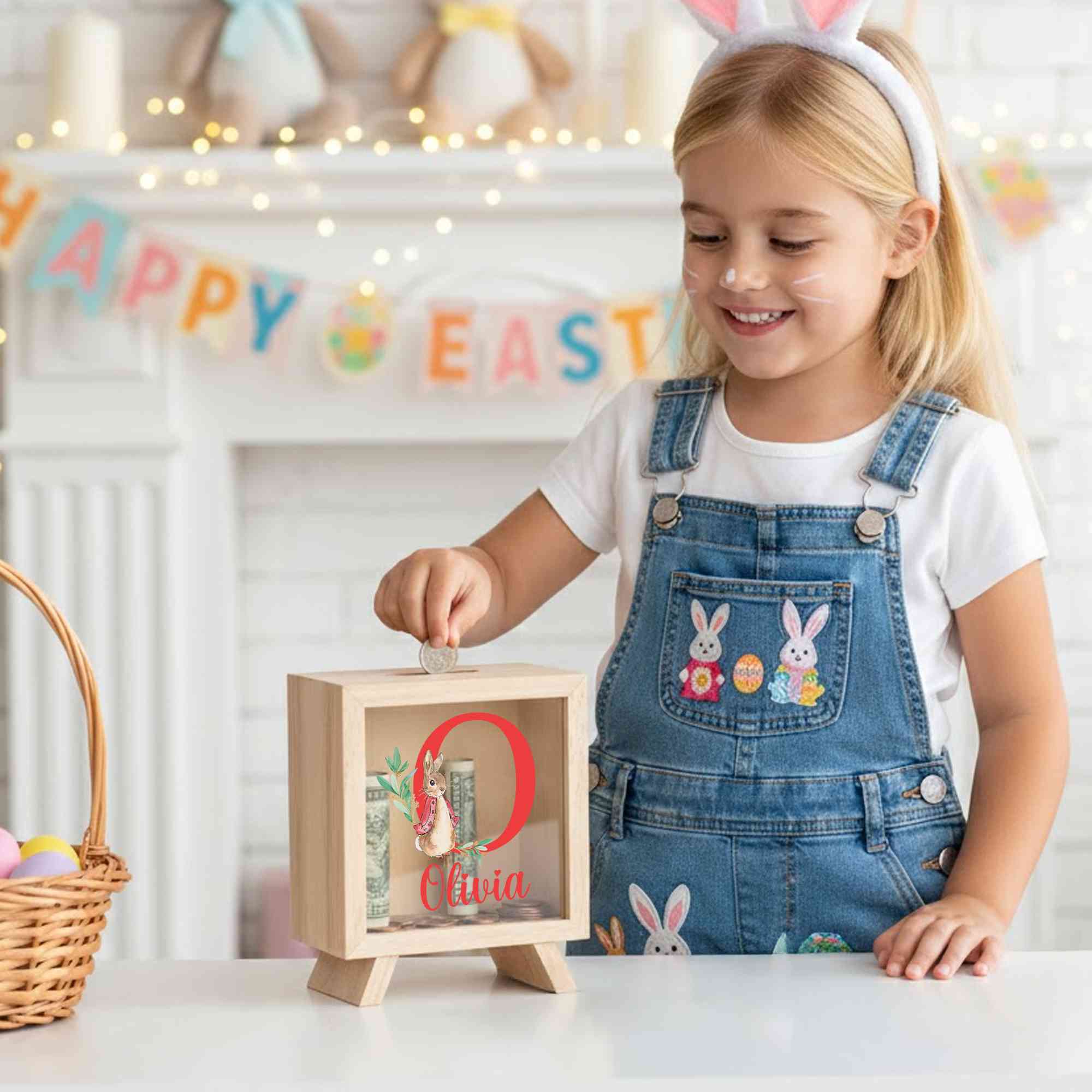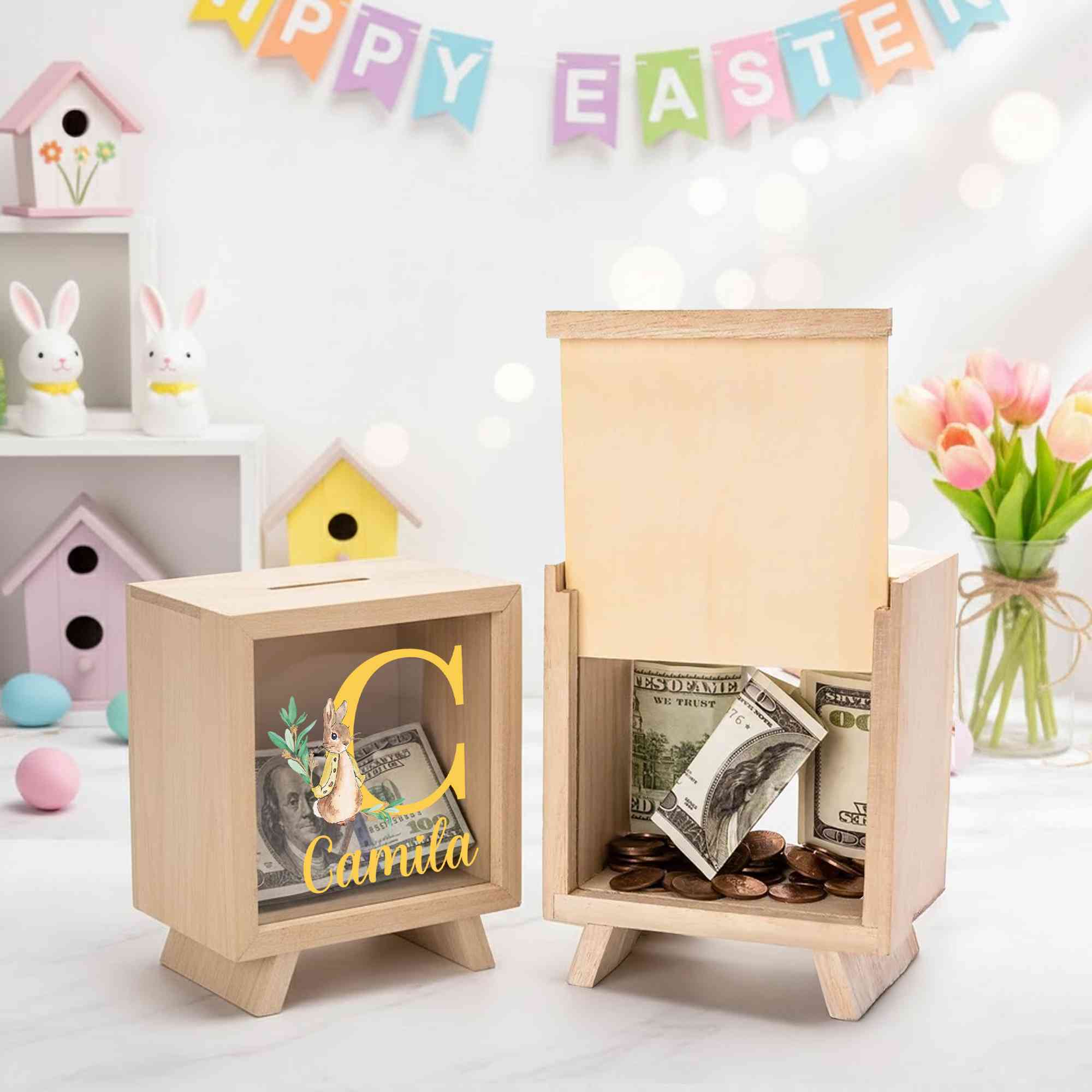 Personalized Cartoon Peter Rabbit Alphabet Piggy Bank with Name, Wooden Clear Window Money Box Saving Bank, Birthday/Easter Gift for Kids/Boys/Girls