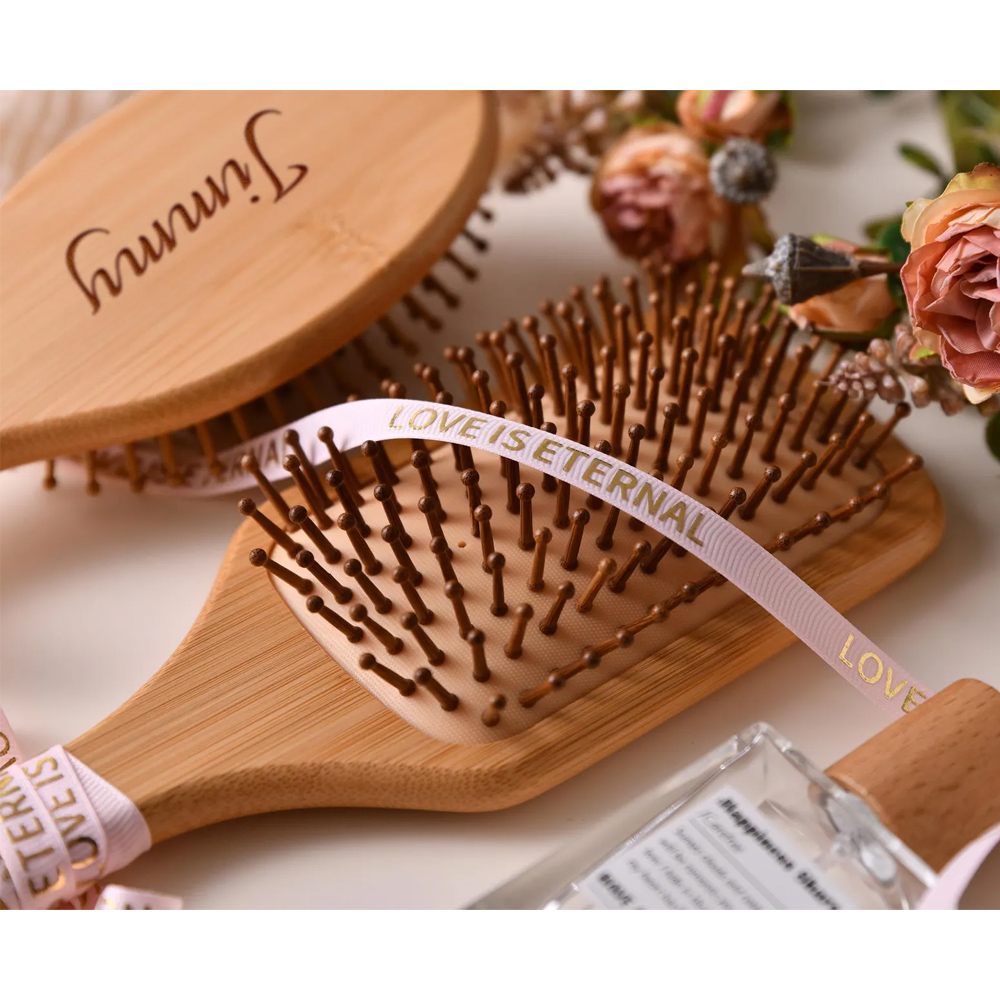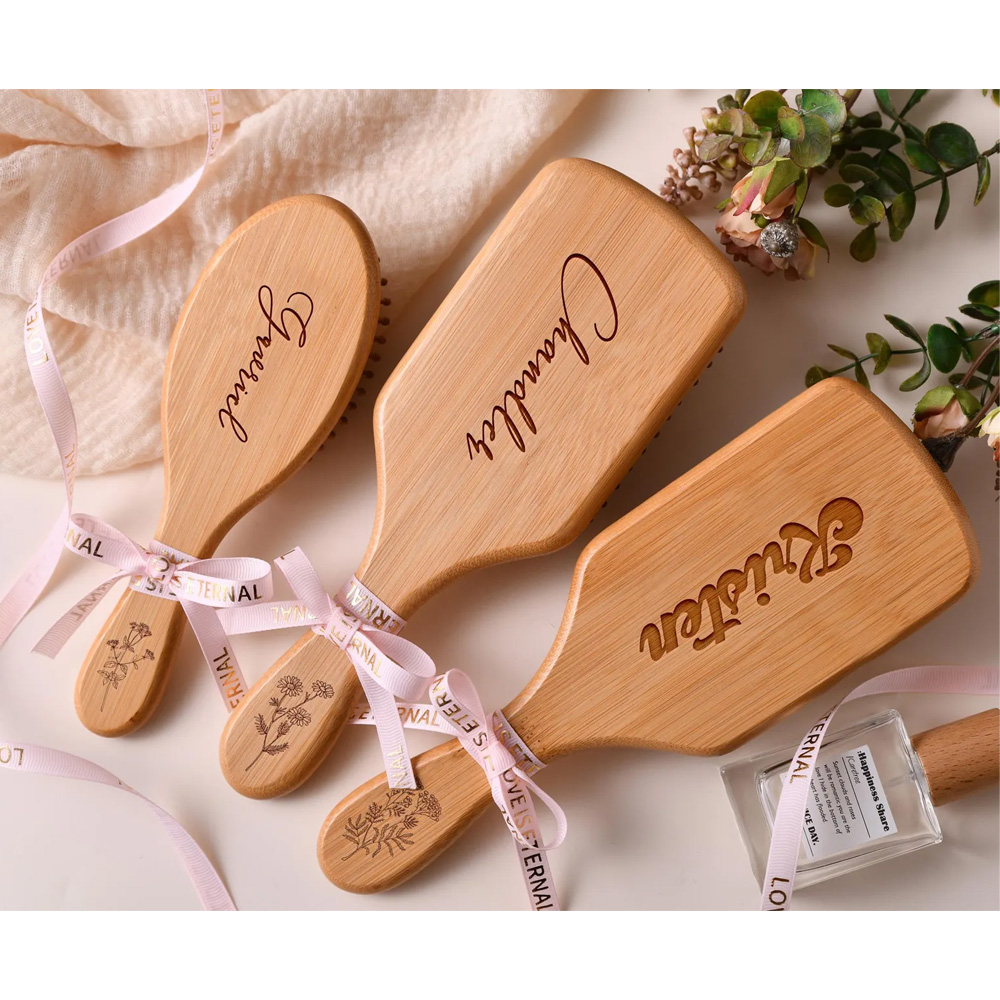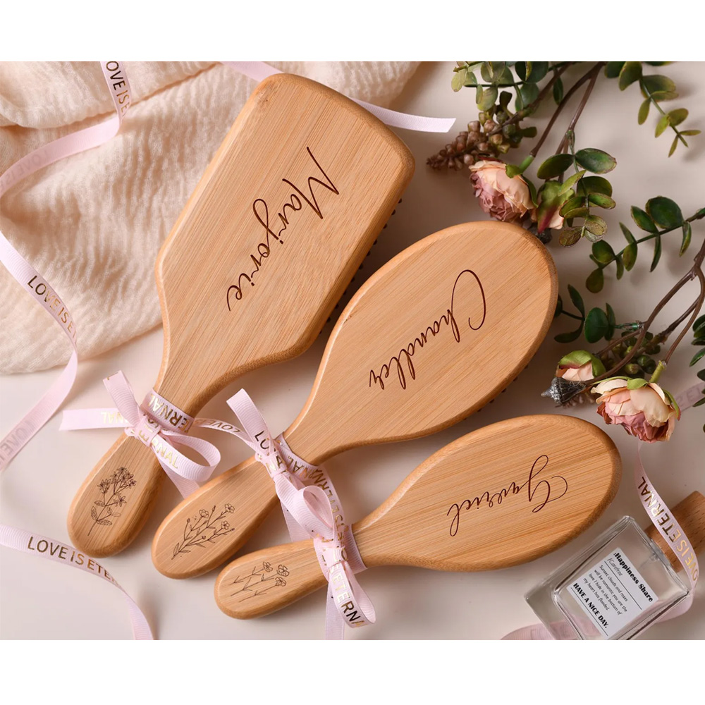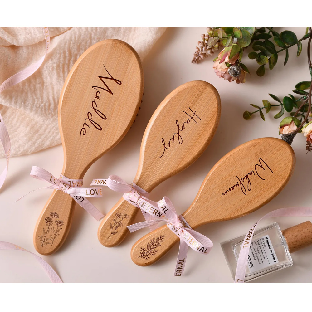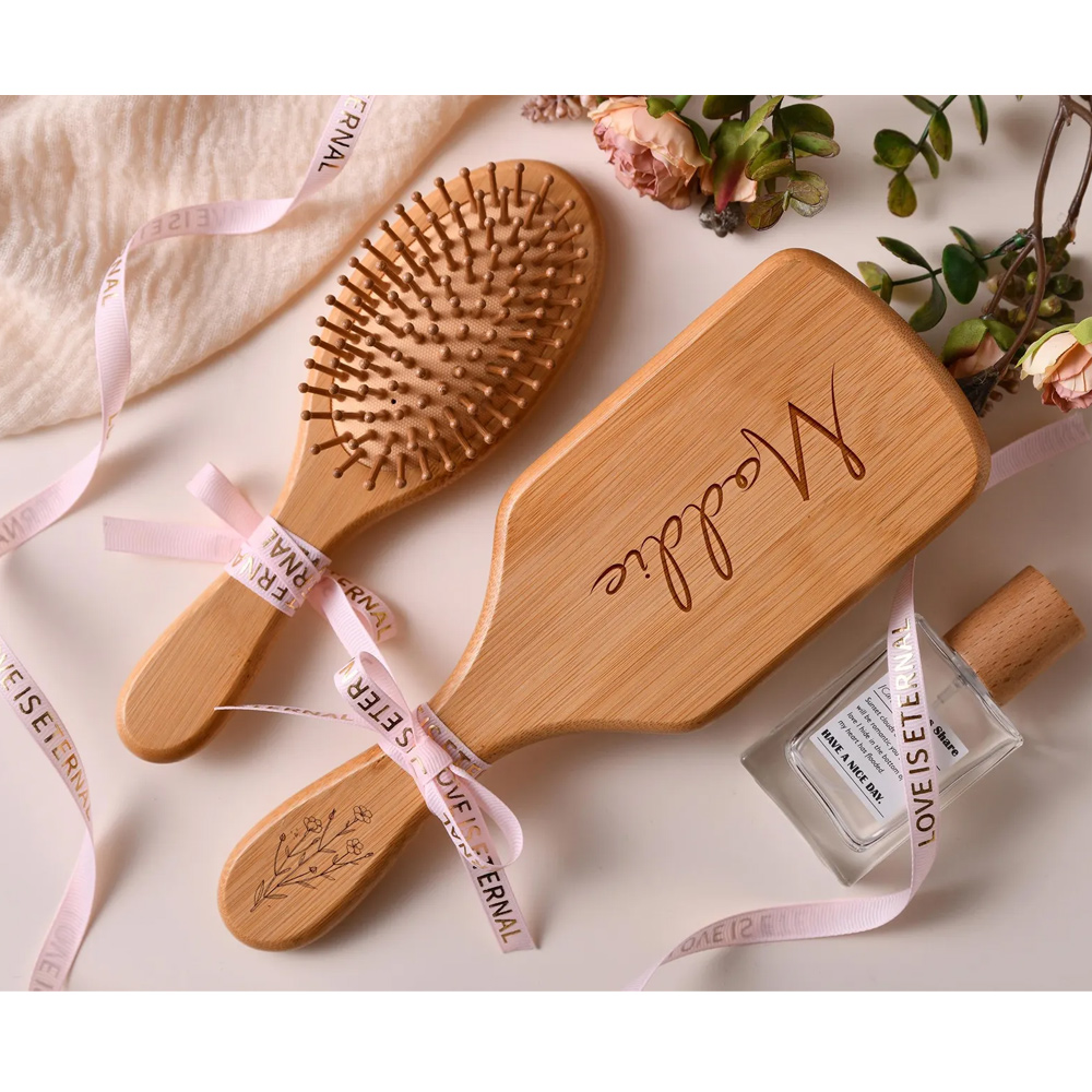 Hairbrush with Engraved – A smooth, natural wood brush featuring a beautifully scripted name engraved on the surface. The elegant design adds a personal touch to a timeless grooming essential.