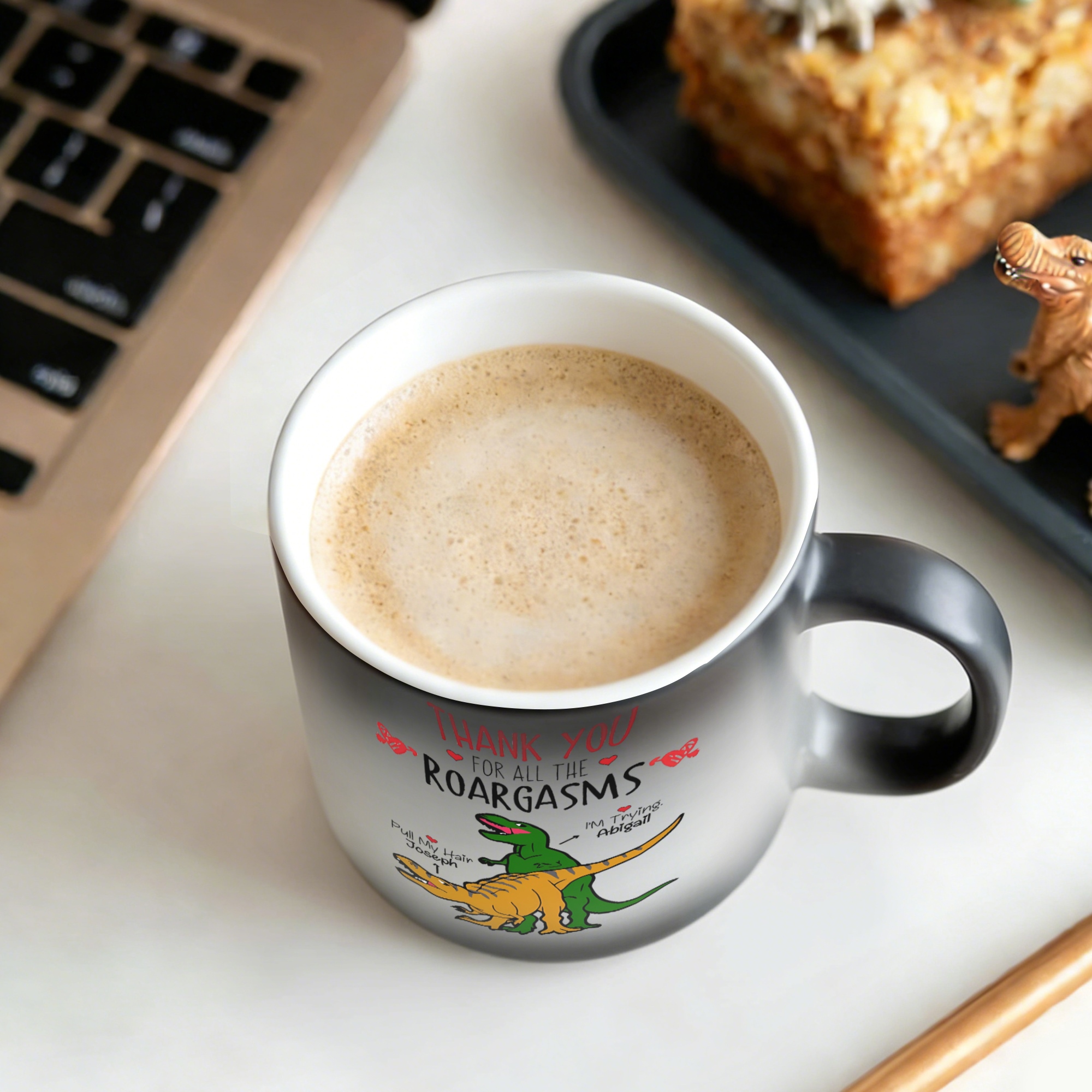Playful T-Rex Couple Design - This dinosaur mug features a cute T-Rex couple with hearts and funny words, creating a lighthearted and loving look that brings smiles during every coffee break. The heat-activated artwork adds a surprise effect as the dinosaurs couple appear when hot drinks(>60℃/140℉) are poured in.