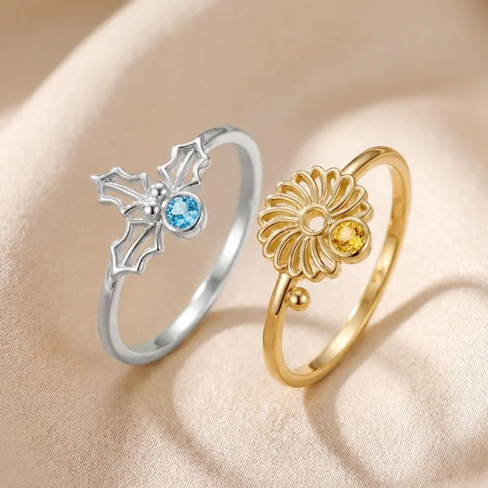 Hollow Floral Design – This elegant ring features a delicate hollow flower motif with graceful petals and a small round birthstone nestled at its center. Crafted in a minimalist style, the openwork design allows light to pass through, creating a soft, airy glow that enhances its feminine charm and timeless beauty.