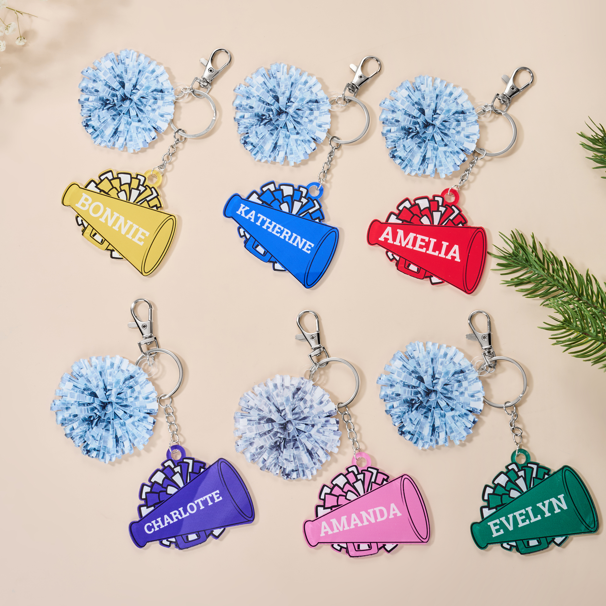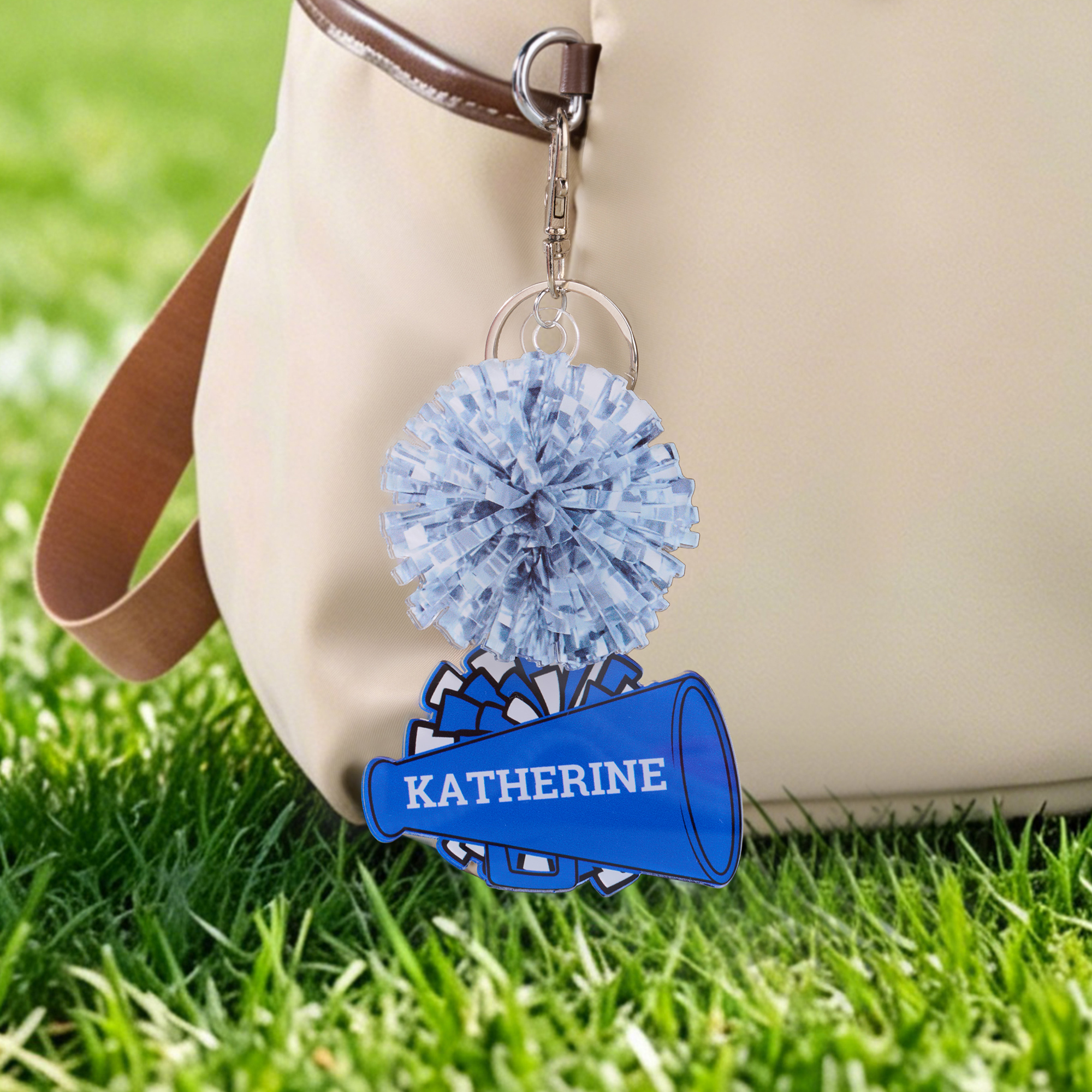 Cheer-Inspired Design - This personalized keychain features a classic cheer megaphone paired with a pom pom charm, creating a fun and energetic accessory that celebrates team spirit. Its bright multicolor design adds a playful touch to backpacks, sports bags, and key rings, making it a perfect cheerleader bag charm.