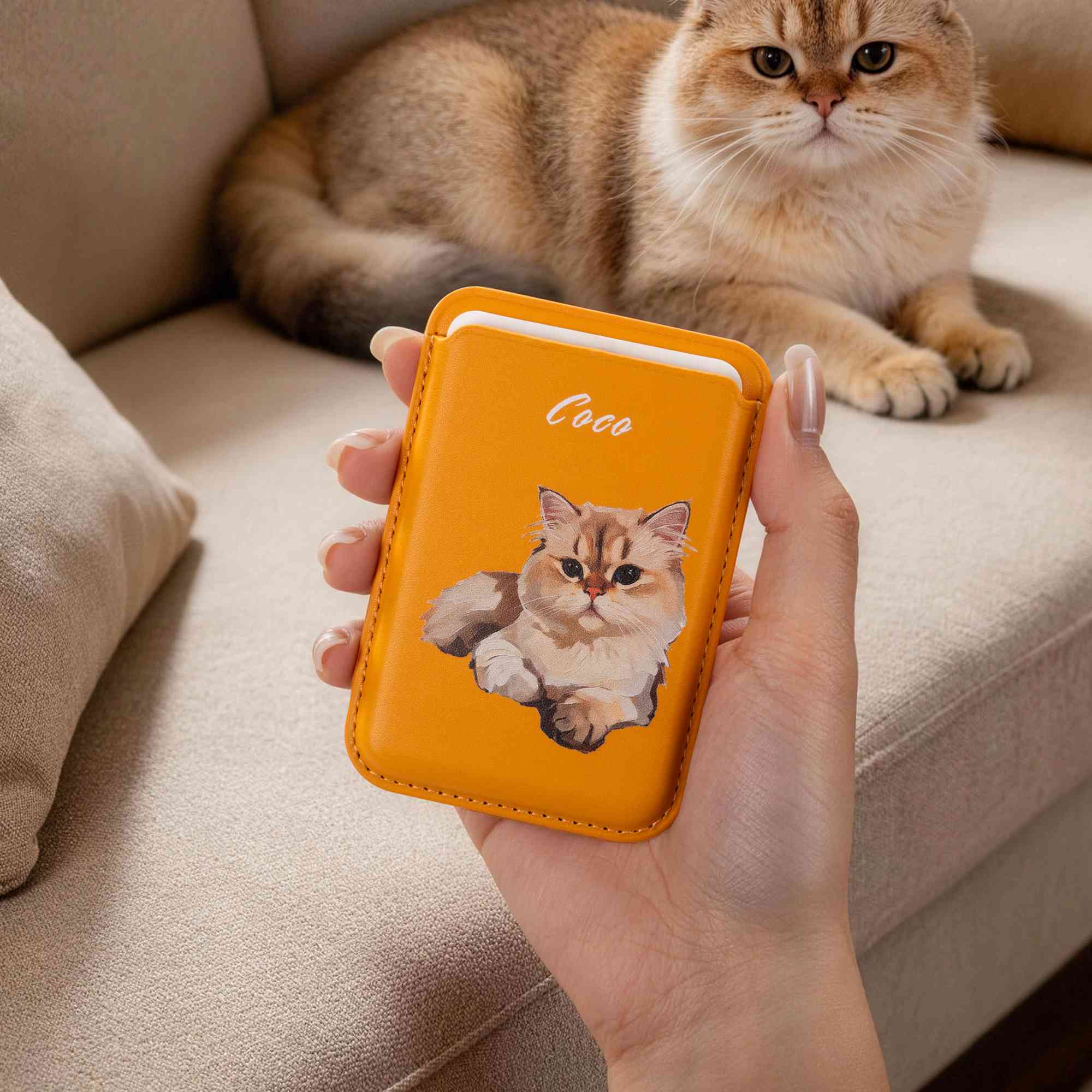 Custom Pet Artwork – This elegant MagSafe wallet features a beautifully hand-drawn portrait of your beloved pet—whether it’s a dog or a cat—crafted from your personal photo. Each portrait is printed in high resolution with lifelike detail, capturing your pet’s unique expression and personality. The artwork is paired with a stylish custom name, adding a heartfelt personal touch.